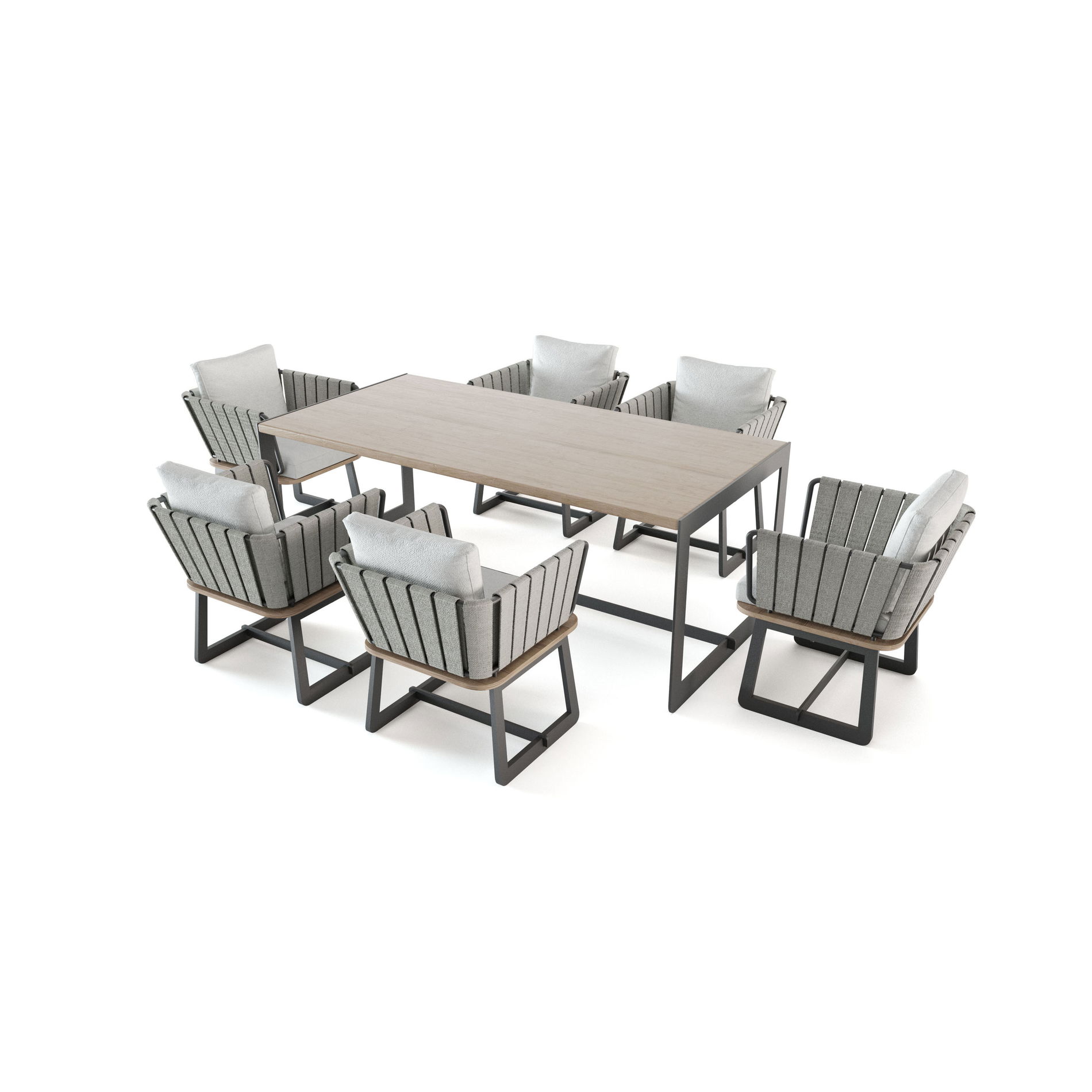 Das Aurora Dining Set bringt die Eleganz urbanen Designs an den Esstisch im Freien. Die Kombination aus einem attraktiven Aluminium-Tisch mit klaren Formen und komfortablen Sesseln mit hellgrauer Seilbespannung schafft ein Ensemble, das sowohl ästhetisch als auch einladend wirkt. Die Mischung aus hellen Stoffen, warmer Holzoptik und dunklen Akzenten verleiht dem Set eine moderne Kontrastwirkung, die den Outdoor-Bereich aufwertet. Mit seiner hochwertigen Verarbeitung bietet das Aurora Dining Set die perfekte Basis für stilvolle Dinner im Freien – von der geselligen Runde bis zum exklusiven Abendessen unter urbanen Himmel.